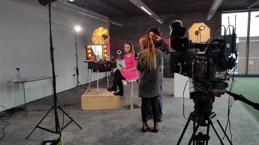 Filming a beauty tutorial with a woman in a pink dress sitting in front of a mirror, surrounded by professional lighting, camera equipment, and crew members in a modern studio.