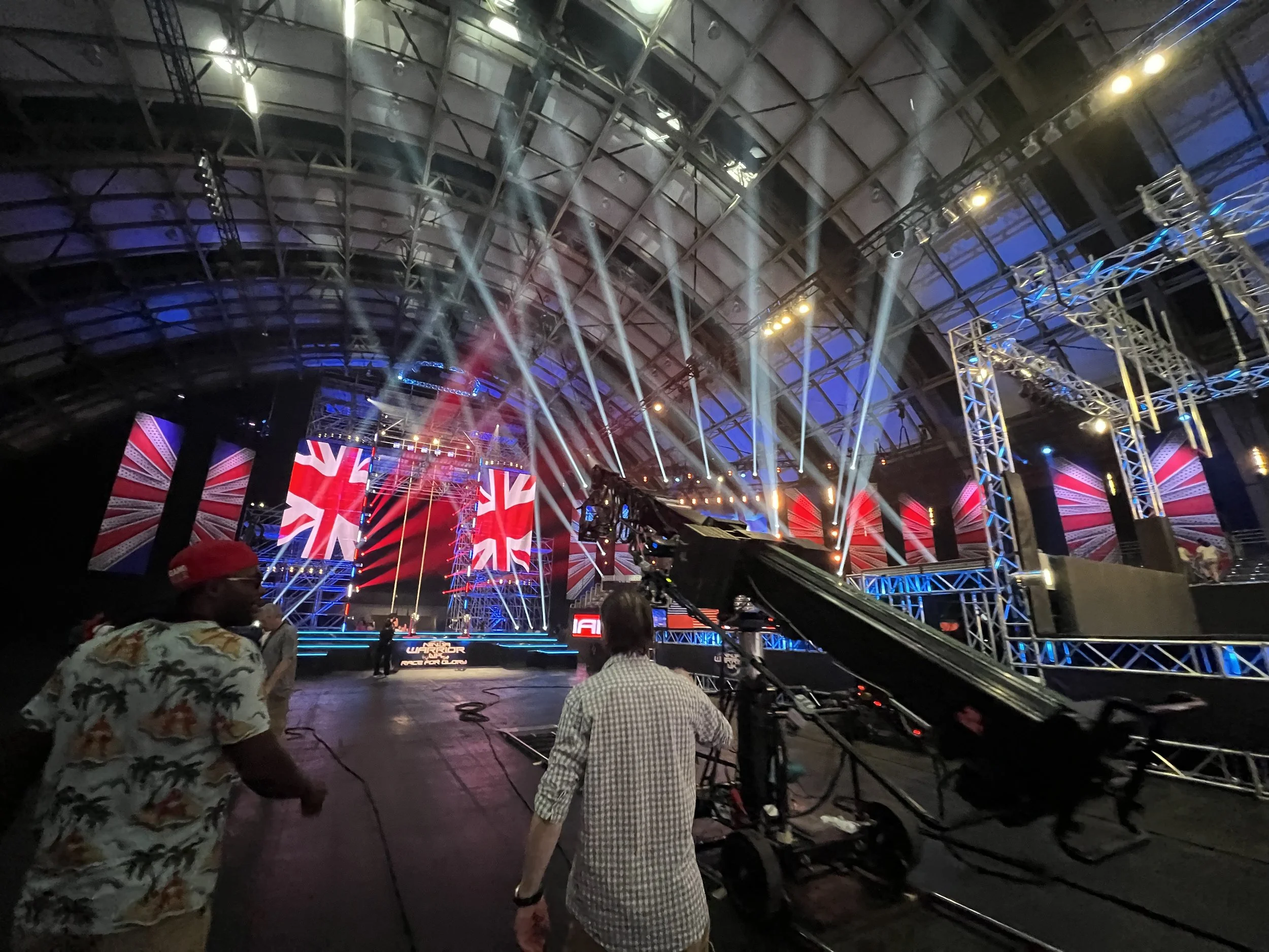 Stage set up with British flags, bright lights, and camera equipment, likely in a large indoor arena or stadium.