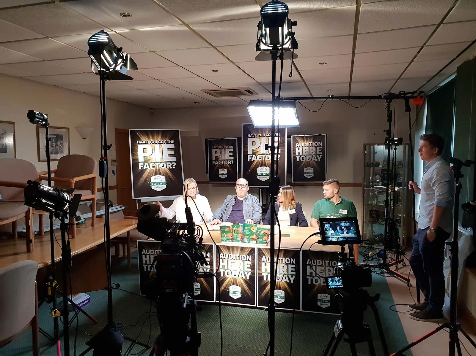 A panel of four people sitting at a table during a recording session, with several cameras and lighting equipment set up around them. There are promotional posters on the wall behind the panel advertising a quiz show. View fullsize