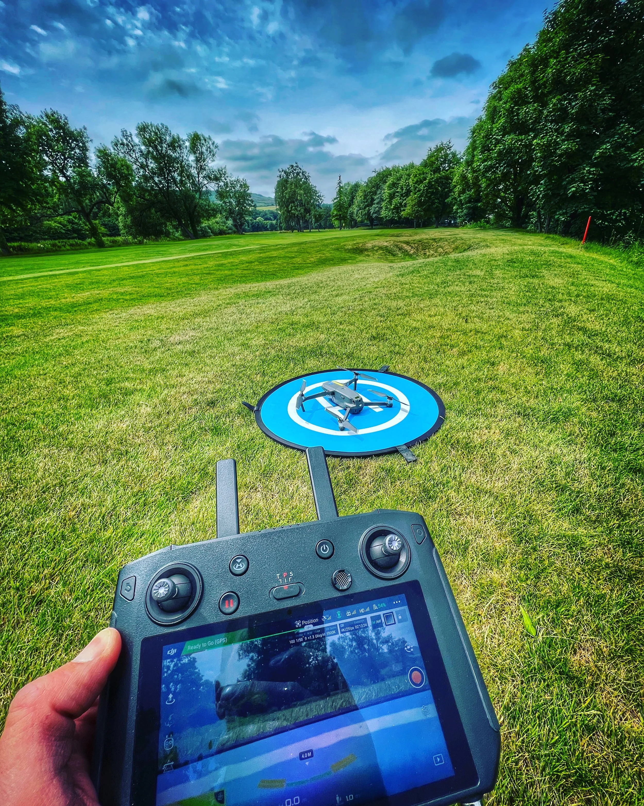 A person holding a drone remote controller in a grassy field on a golf course while a small drone hovers above a landing pad. Trees and a partly cloudy sky are in the background. View fullsize