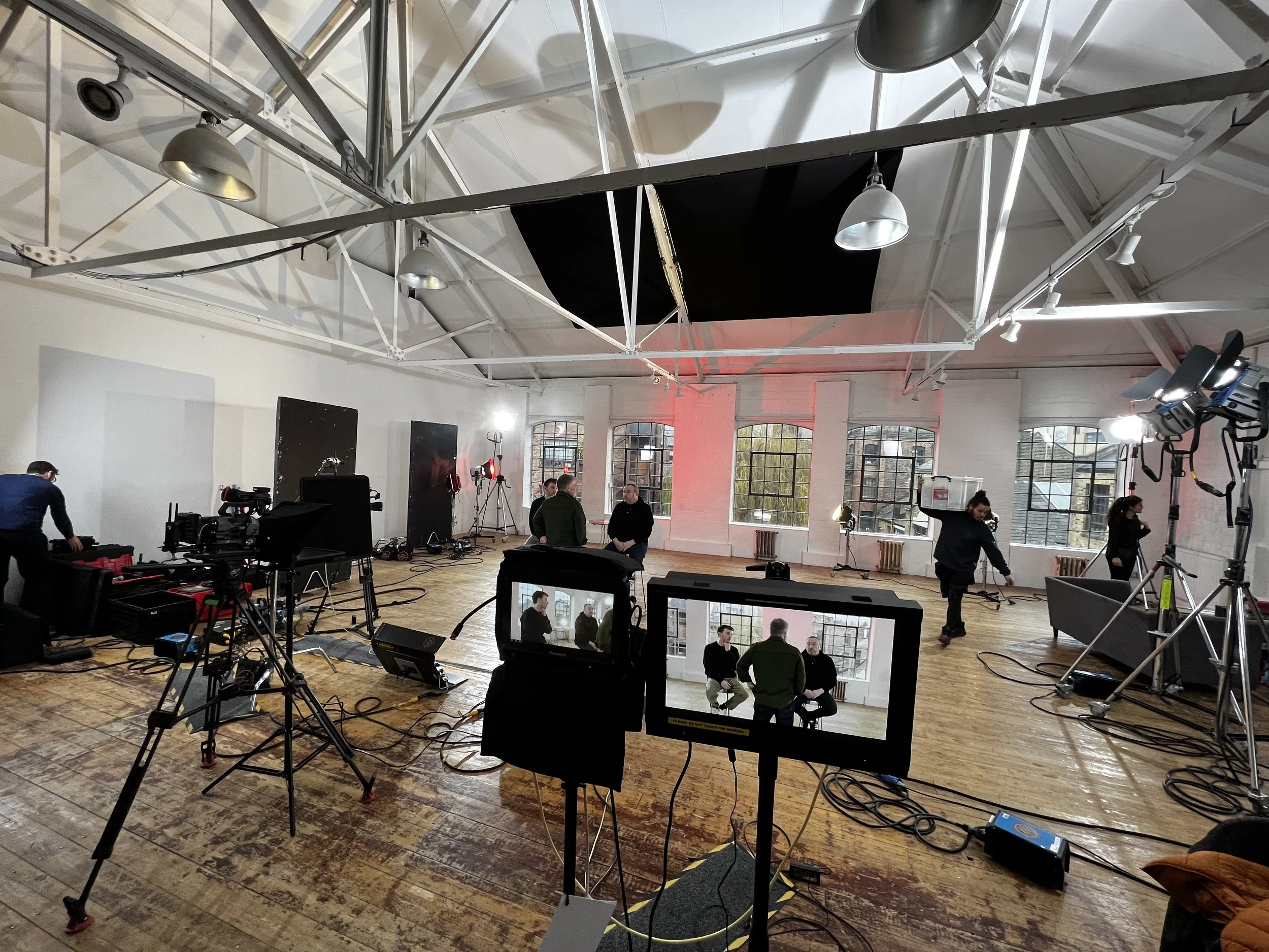 A professional video or photo shoot in an industrial-style studio with large windows, lighting equipment, cameras, and crew members preparing for an interview or recording session.